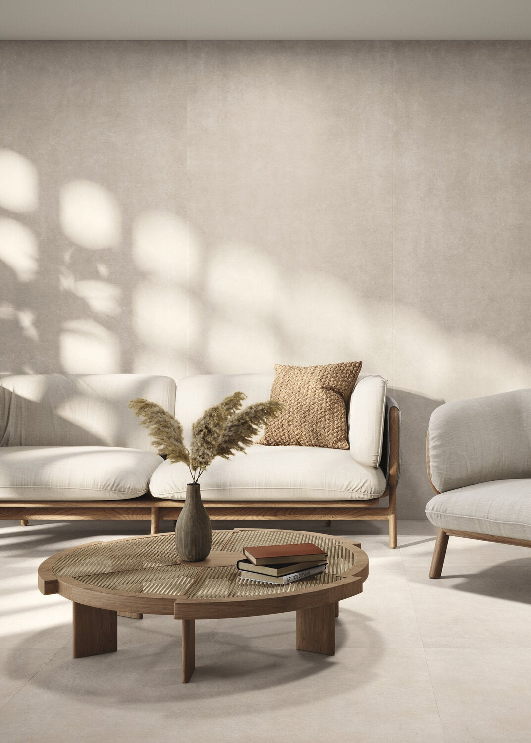 Feinsteinzeugfliese in moderner Beton-/Industrieoptik in Taupe für ein warmes, urbanes Raumambiente. Strapazierfähig und ideal für Wohnbereiche, Bäder und stilvolle Objektflächen.