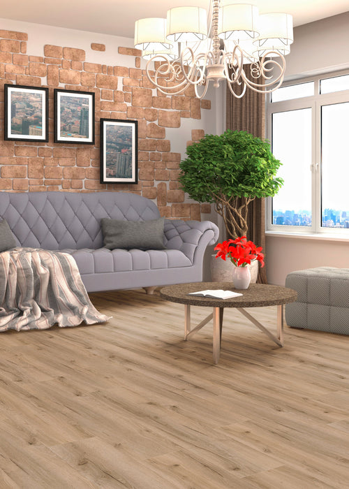 Ausdrucksstarker Designboden in markanter Eichenoptik mit matter Oberfläche für ein lebendiges, natürliches Raumgefühl. Pflegeleicht, formstabil und ideal für moderne Wohnbereiche.