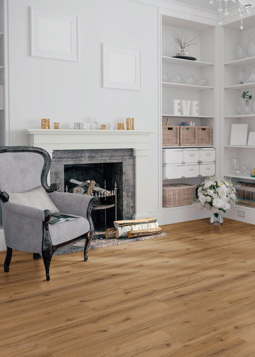 Natürlicher Designboden in klassischer Eichenoptik mit matter Oberfläche für ein zeitloses, wohnliches Raumambiente. Pflegeleicht, formstabil und ideal für vielseitige Wohnbereiche.