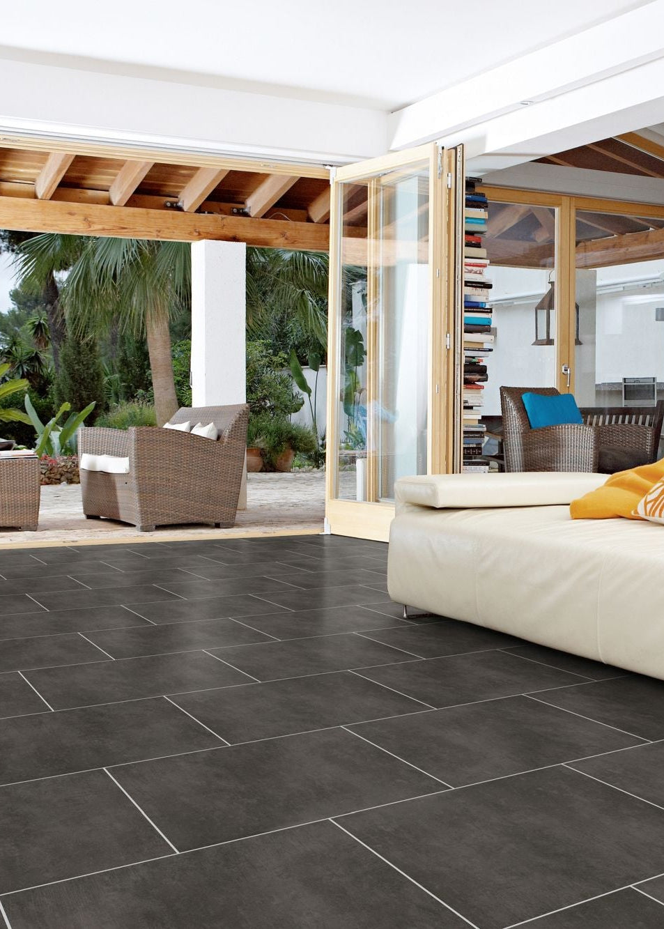 Moderner Designboden in Schieferoptik mit matter Oberfläche für ein elegantes, zeitloses Raumambiente. Pflegeleicht, formstabil und ideal für moderne Wohn- und Arbeitsbereiche.