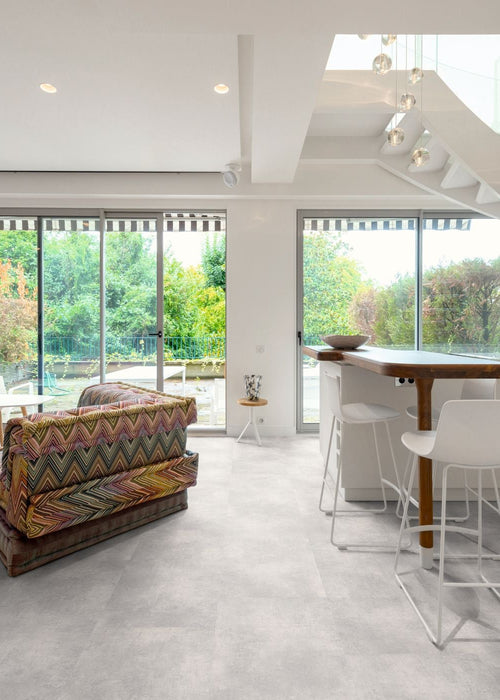 Zeitloser Designboden in authentischer Steinoptik mit matter Oberfläche für ein klares, modernes Raumambiente. Pflegeleicht, formstabil und ideal für Wohn- und Arbeitsbereiche.